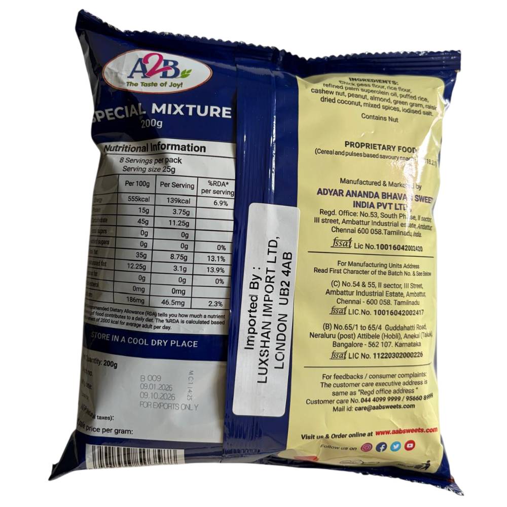 A2B Spl Mixture, a captivating snacking option that tantalises both your taste buds and tummy. This sweet and spicy blend of fried peanuts, cashews, and raisins offers a delectable and aromatic experience that will appeal to snack enthusiasts. What sets this mixture apart is its incorporation of nutrient-rich ingredients, providing a nourishing boost to your body. With its crunchy texture and vibrant colours, A2B Spl Mixture promises a sensory delight with every bite. The harmonious balance of sweet and savoury flavours will have you reaching for more, whether you enjoy it as a midday snack or a party appetiser. Despite its indulgent taste, this mixture is light on the stomach and easy to digest, making it an ideal choice for those seeking a satisfying snack without feeling weighed down. Embrace the authentic South Indian flavours and the perfect blend of cashews and peanuts fried in fresh edible oil for a truly crunchy and flavourful experience.