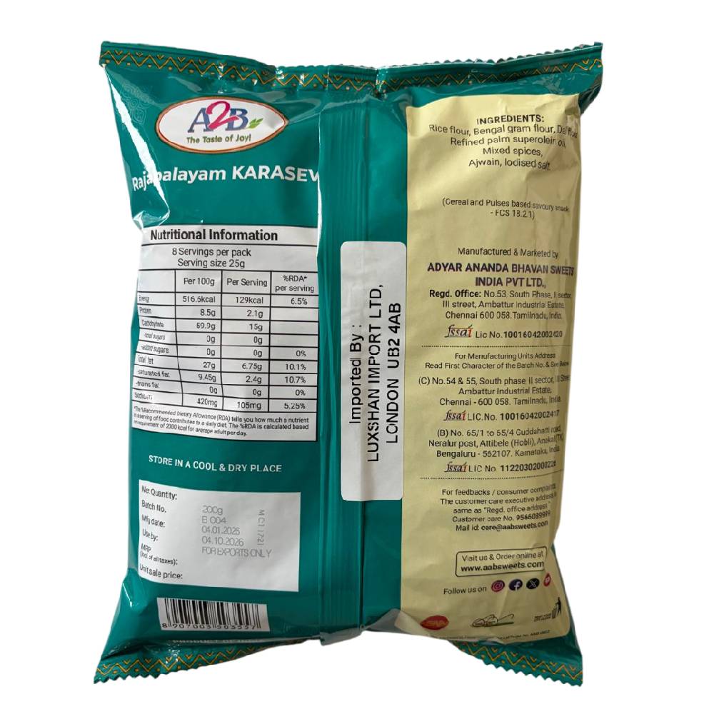 Indulge in the authentic flavours of South India with A2B Rajapalayam Karasev, a savoury snack crafted using traditional recipes. Prepared from high-quality chickpea flour dough and a delectable blend of spices, this crunchy delight is deep-fried to perfection in fresh edible oil, ensuring a tantalising taste in every bite. Bursting with the spice of pepper and the crunchiness of cashews and groundnuts, this karasev offers a truly satisfying snacking experience. Enjoy it as an evening treat with a refreshing cup of tea or coffee, or incorporate it into your daily snack routine for a flavourful twist. Whether you’re celebrating Diwali or simply craving a delicious savoury snack, A2B Rajapalayam Karasev is the perfect choice to indulge your taste buds and create memorable moments with your loved ones.